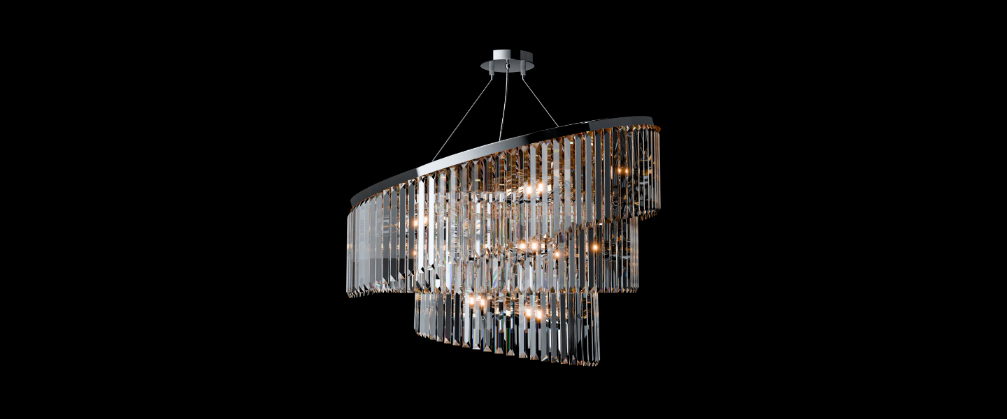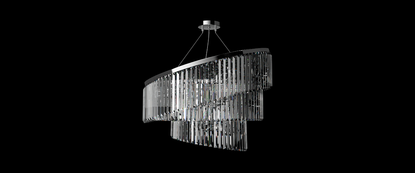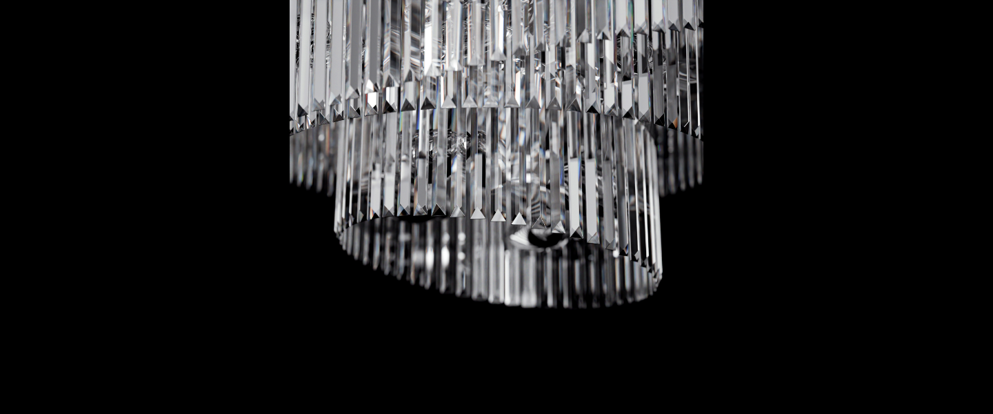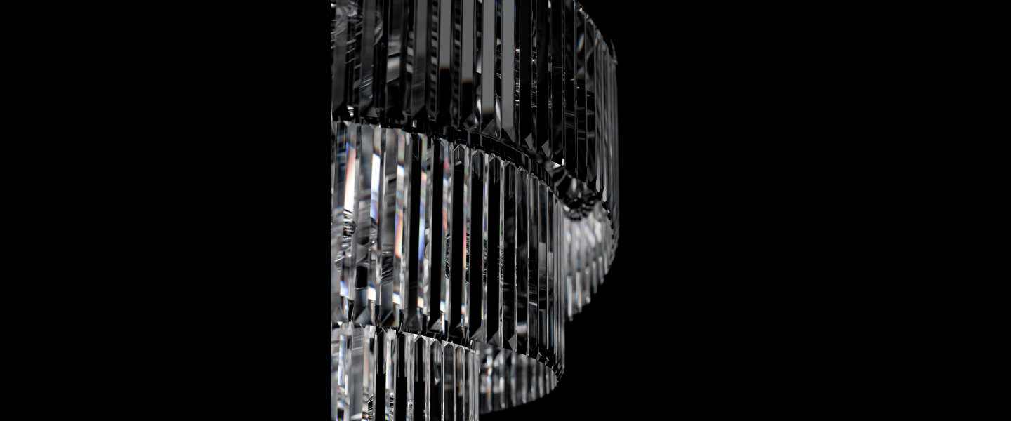Atria redefines chandelier symmetry with a graceful spiral form made of vertically suspended crystal bars. Flowing like a helix of light, its tiered silhouette casts radiant reflections in every direction while appearing to gently rotate midair. Designed to elevate stairwells, entry halls, or atriums, Atria offers movement, brilliance, and sculptural drama.