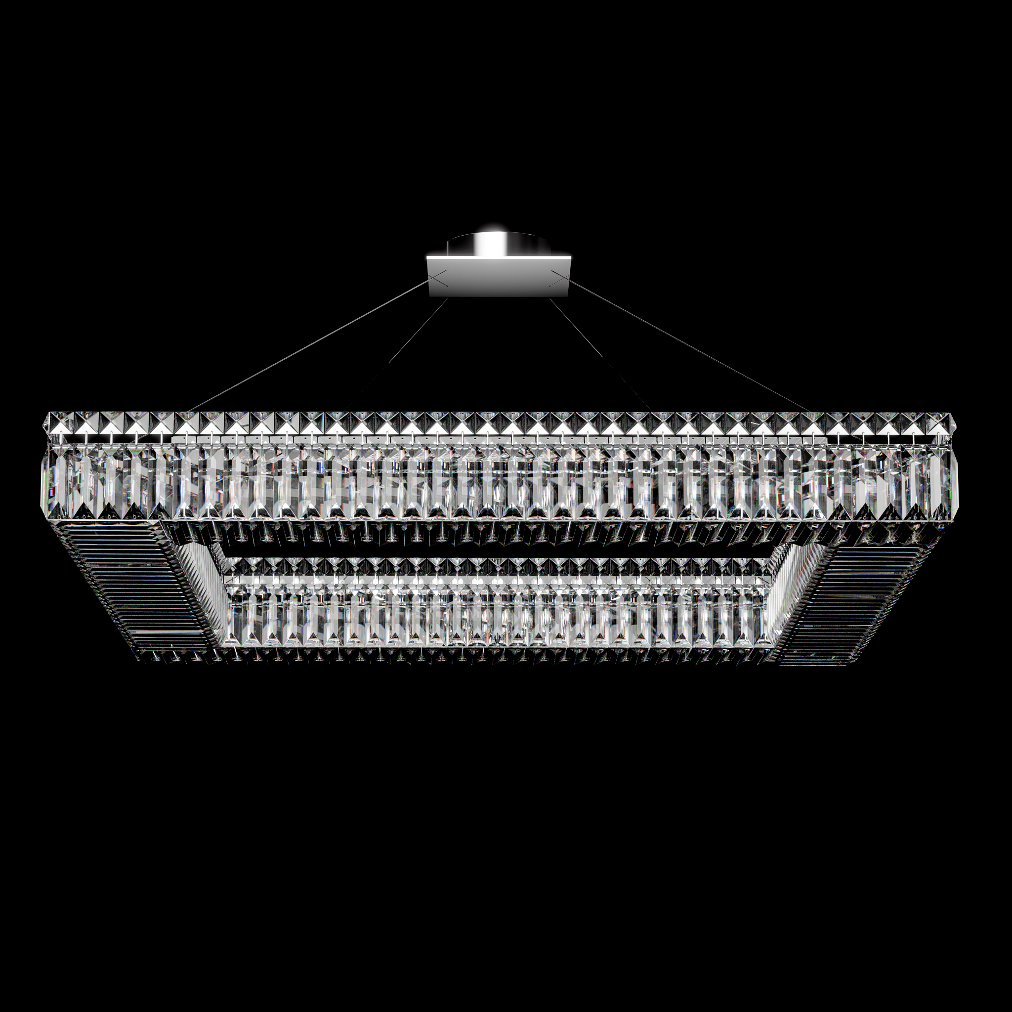 Aurum I is a single-layer rectangular chandelier designed for contemporary spaces that value both order and glow. Its linear frame is clad in precision-cut vertical crystal prisms on all four sides, creating a floating ring of refraction. Suspended by ultra-thin steel cables, it achieves a minimalist levitation effect while casting a balanced, diffused glow across large areas.