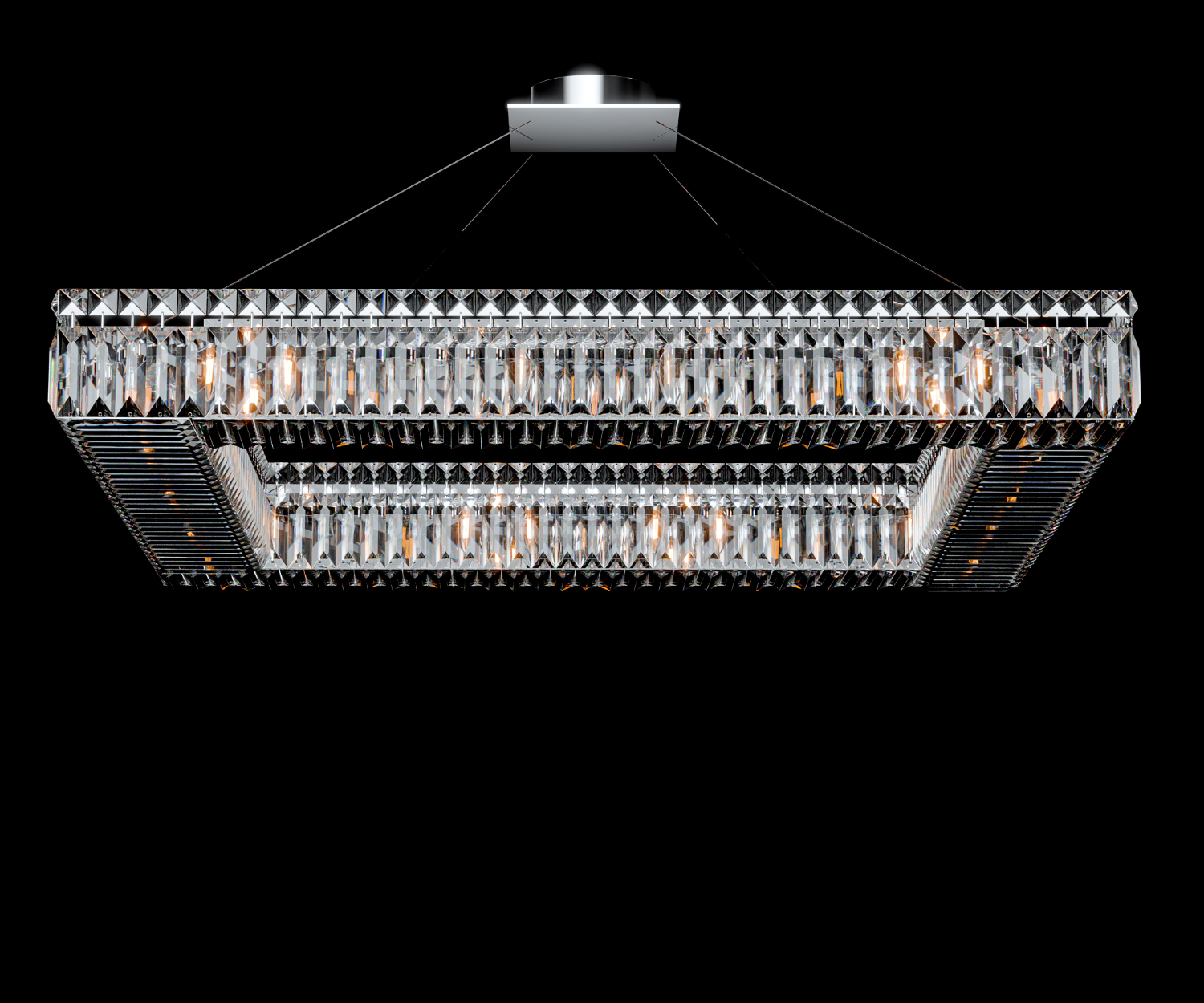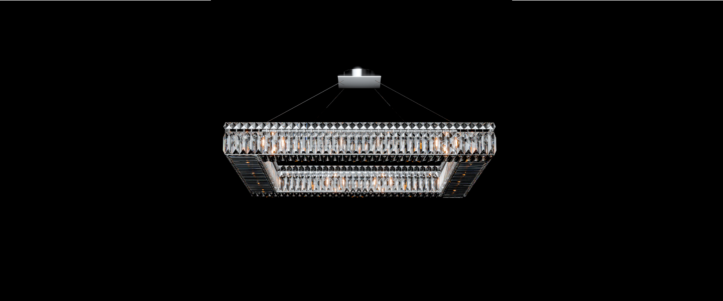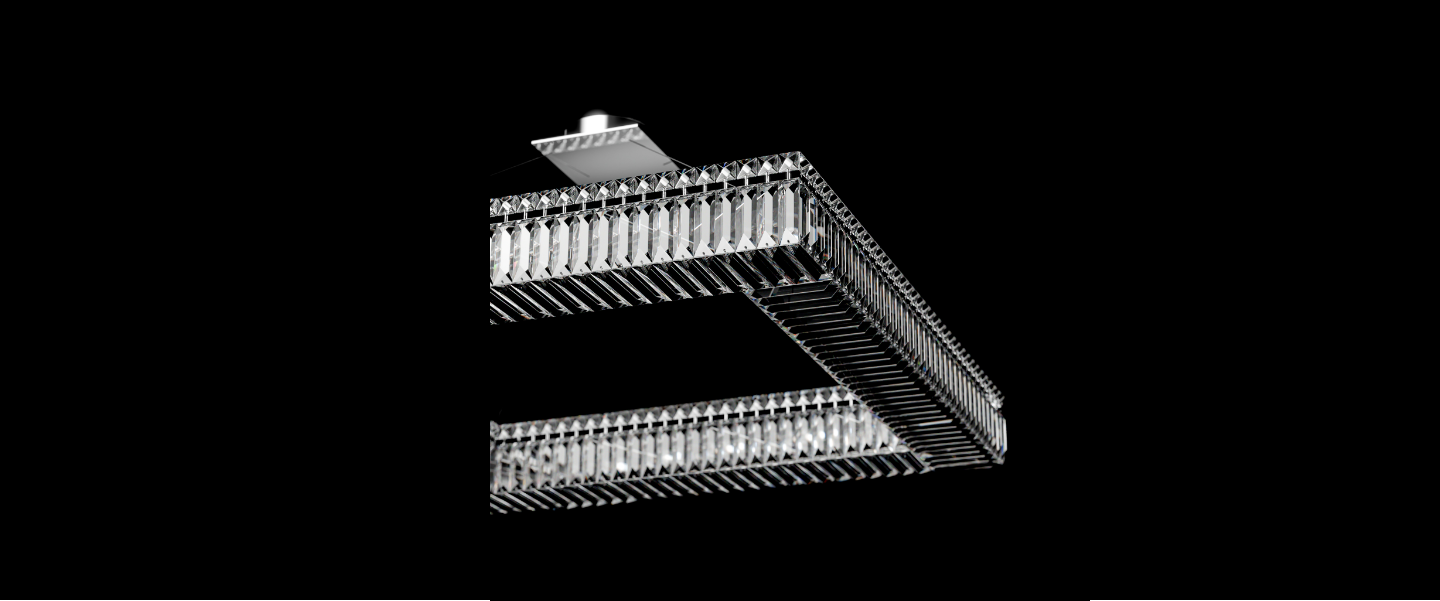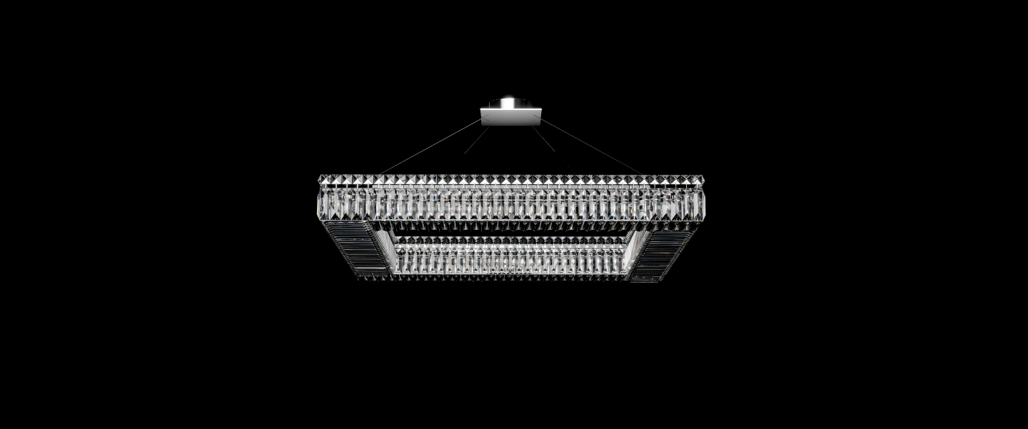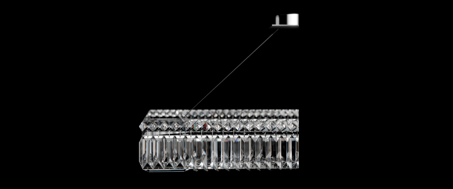 Aurum I is a single-layer rectangular chandelier designed for contemporary spaces that value both order and glow. Its linear frame is clad in precision-cut vertical crystal prisms on all four sides, creating a floating ring of refraction. Suspended by ultra-thin steel cables, it achieves a minimalist levitation effect while casting a balanced, diffused glow across large areas.