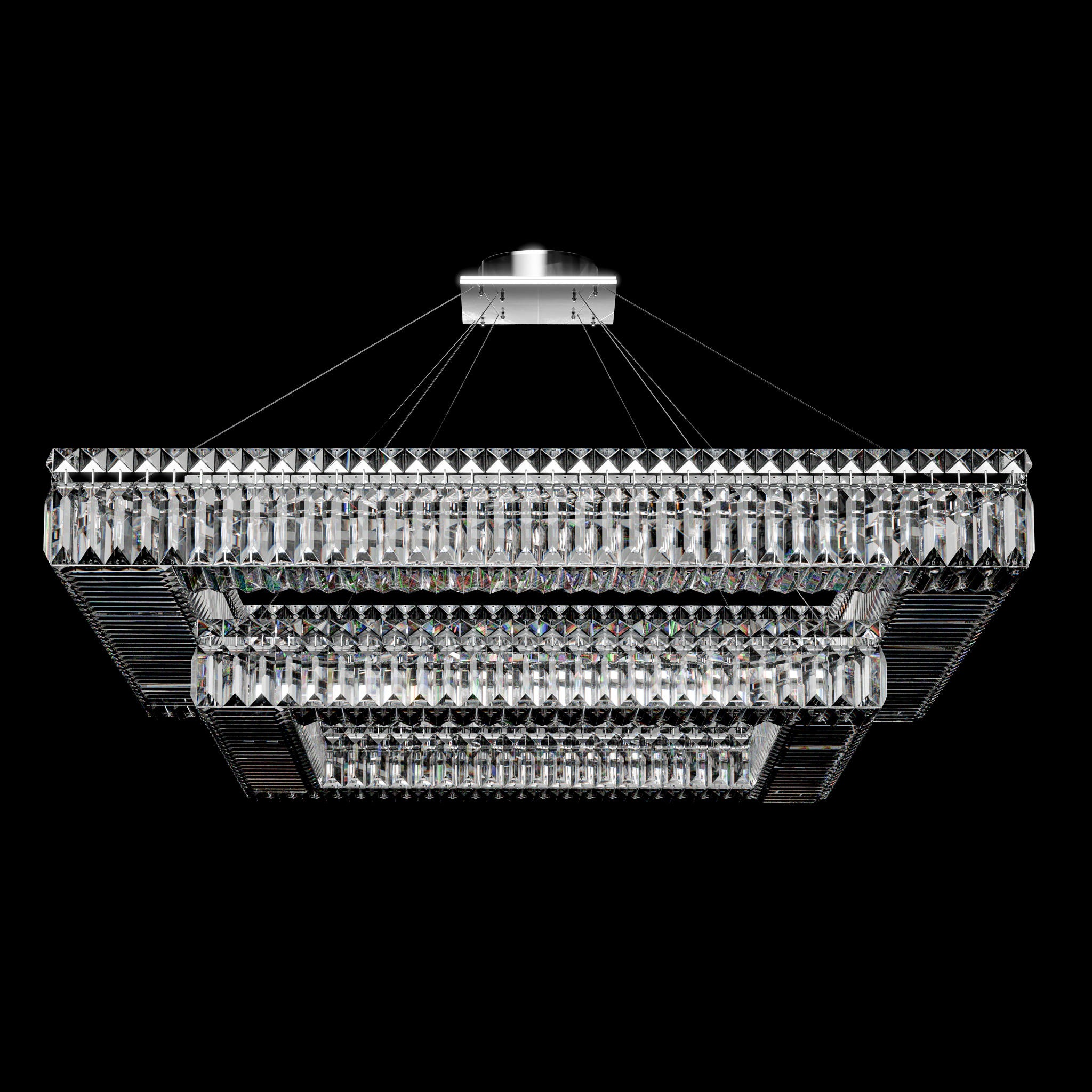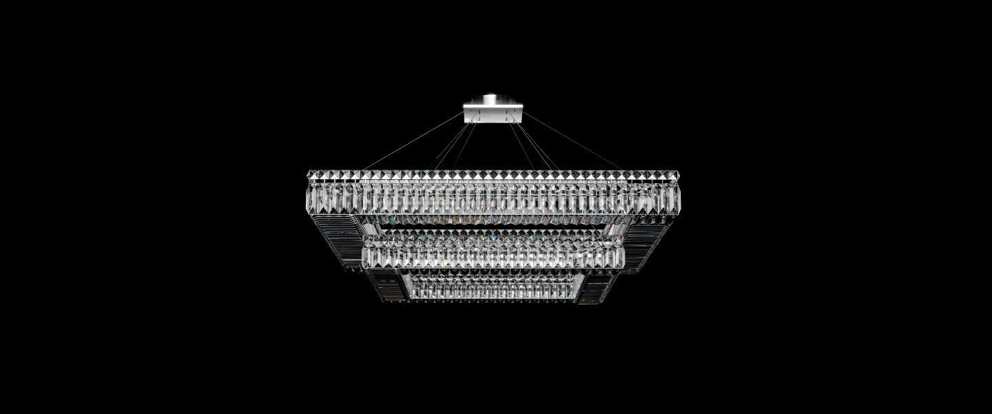 Aurum II is a two-tiered evolution of RarePrism’s signature Aurum chandelier. Featuring a stacked rectangular structure with precision-cut vertical crystals on both frames, it creates a layered composition of reflection and refraction. The result is architectural and luminous — light travels between tiers, bounces off facets, and fills the space with a balanced, radiant glow.