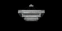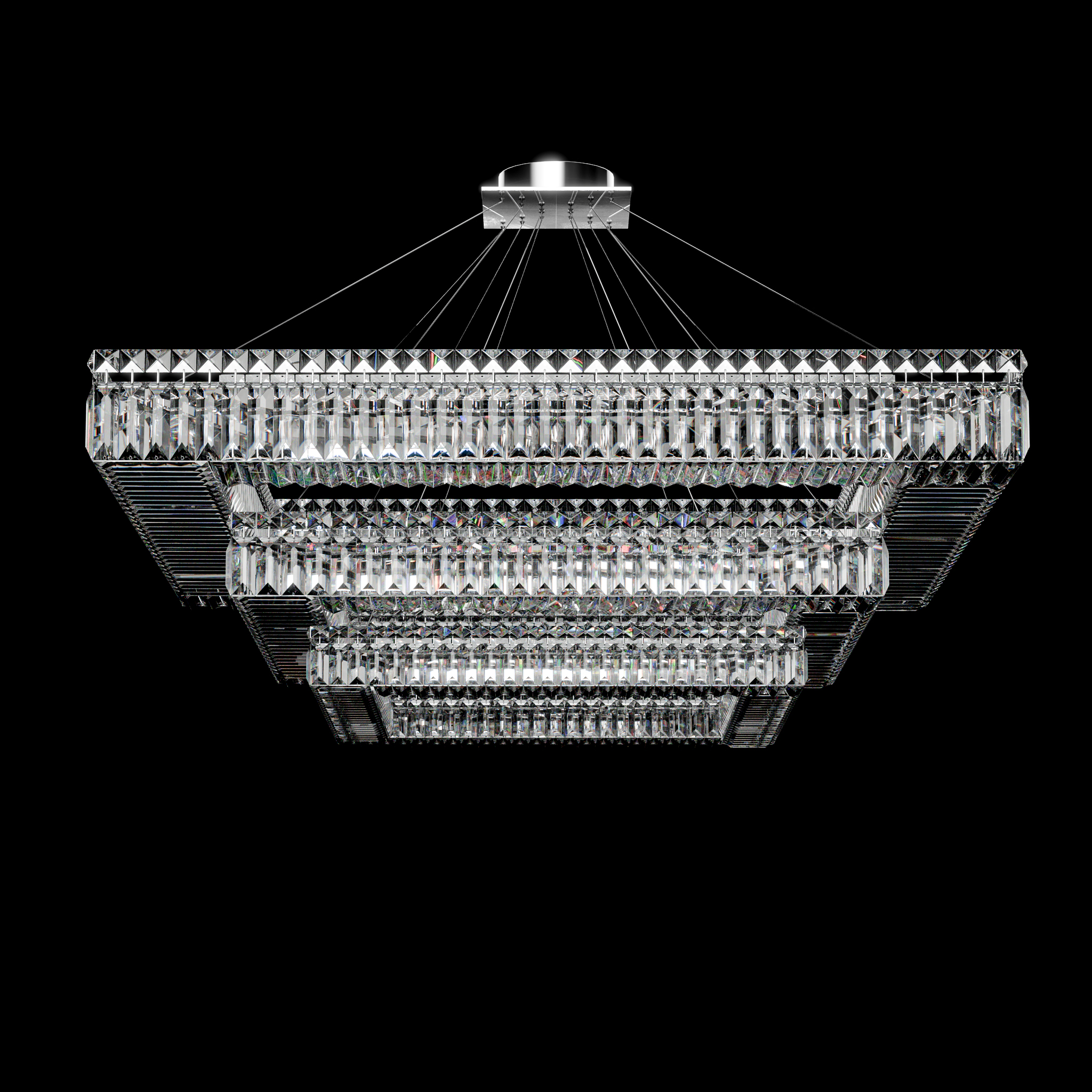 Aurum III is the pinnacle of the Aurum series — a triple-tiered rectangular chandelier designed for the most expansive interiors. Each tier is a floating crystal frame, precision-set with vertical-cut prisms that shimmer with every angle. As the tiers cascade downward, they create layers of brilliance and architectural presence, suspended seamlessly by ultra-fine cables from a centered ceiling mount.