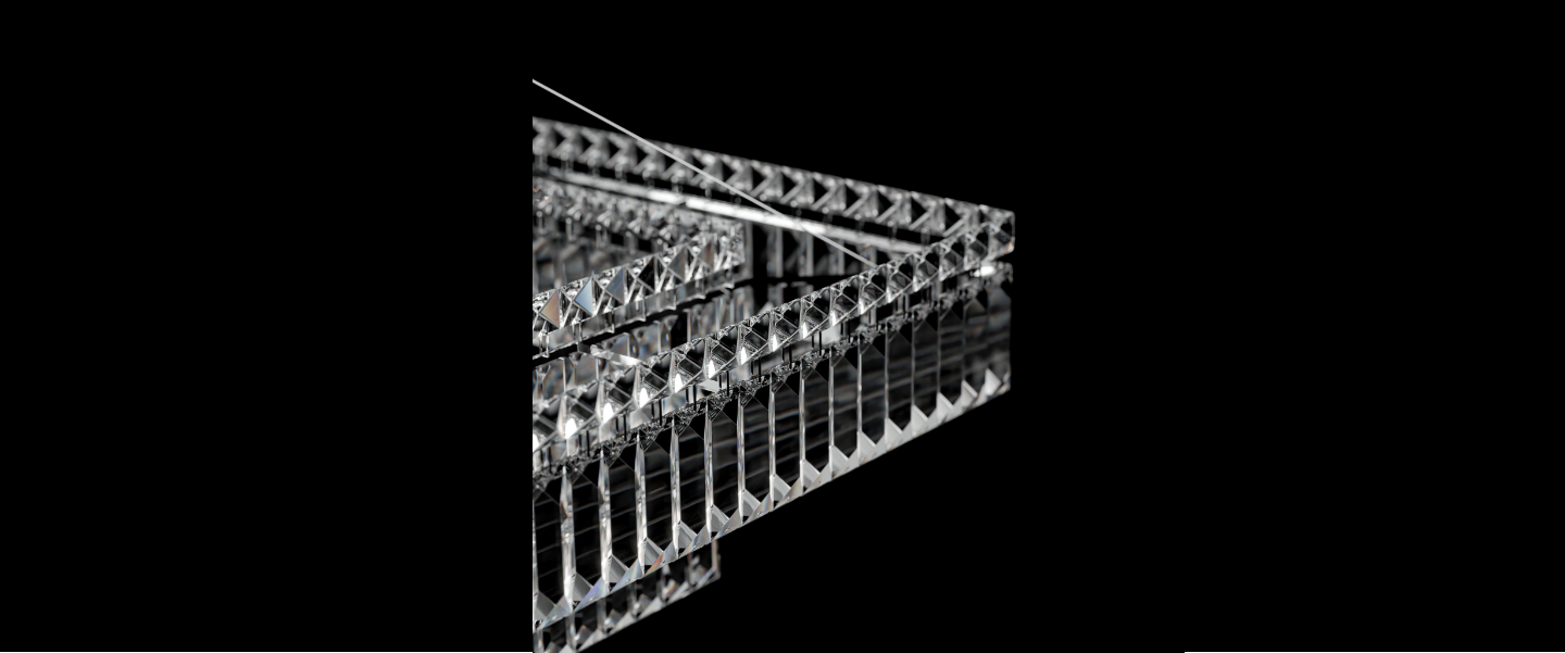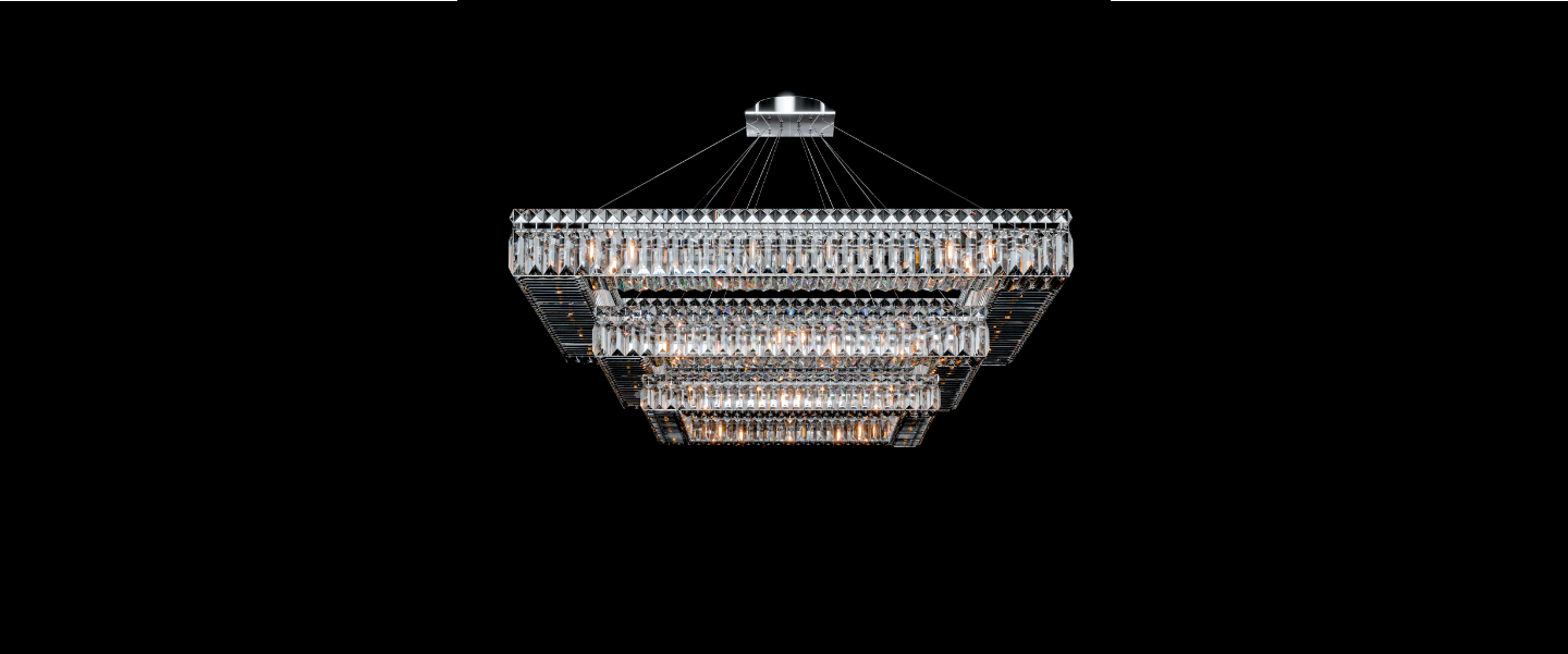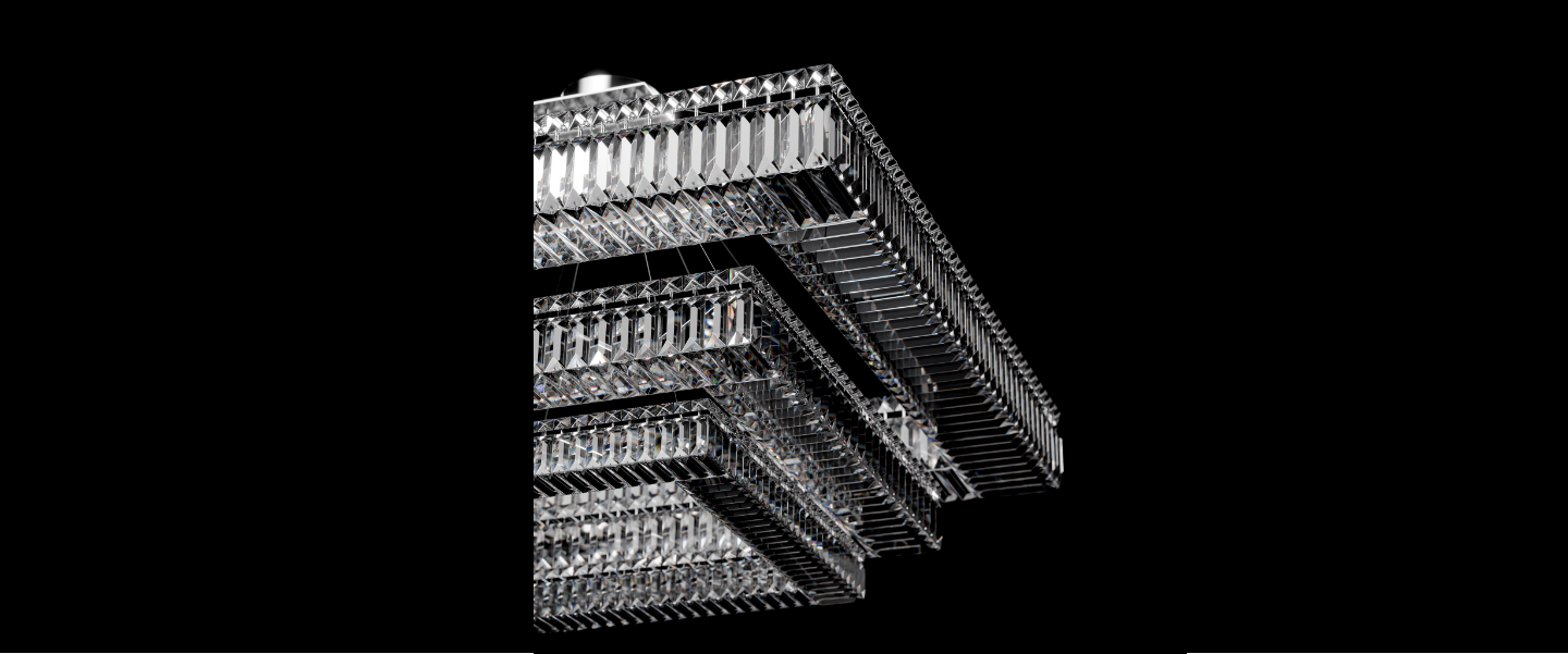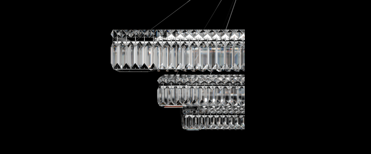Aurum III is the pinnacle of the Aurum series — a triple-tiered rectangular chandelier designed for the most expansive interiors. Each tier is a floating crystal frame, precision-set with vertical-cut prisms that shimmer with every angle. As the tiers cascade downward, they create layers of brilliance and architectural presence, suspended seamlessly by ultra-fine cables from a centered ceiling mount.