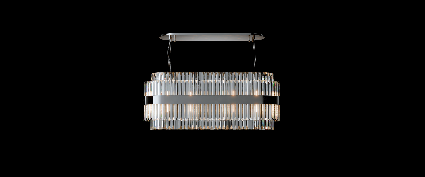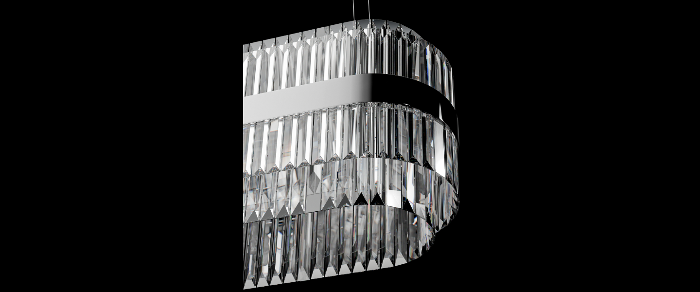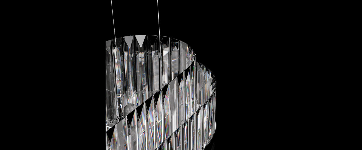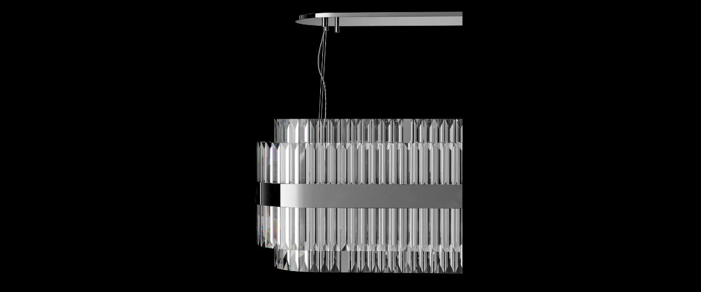 Axis makes a statement through balance — combining vertically set crystal prisms with a sleek metallic band that anchors its form. Suspended from an ultra-slim canopy, its structured silhouette radiates elegance and control. Perfect for dining spaces, reception counters, or galleries, Axis brings architectural precision to ambient lighting.