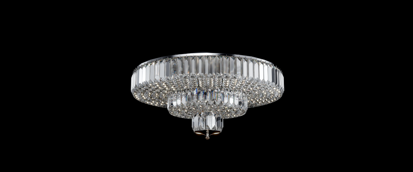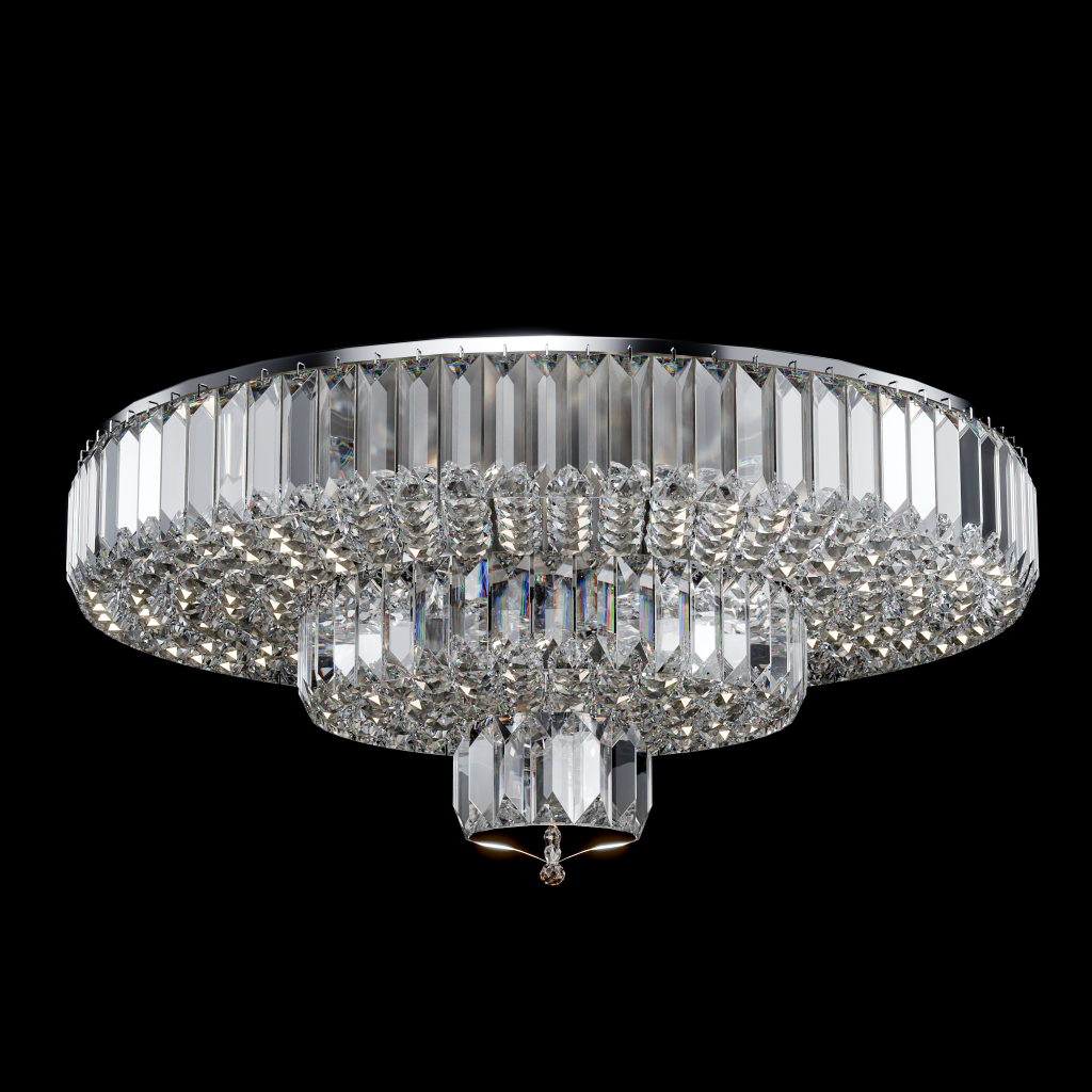 Crown is a flush-mount chandelier that exudes opulence from every angle. Its stepped circular form combines vertical-cut prisms with dense crystal detailing beneath, creating a dome of pure brilliance. Compact yet commanding, Crown is ideal for lower ceilings or intimate spaces where luxury can’t be compromised.