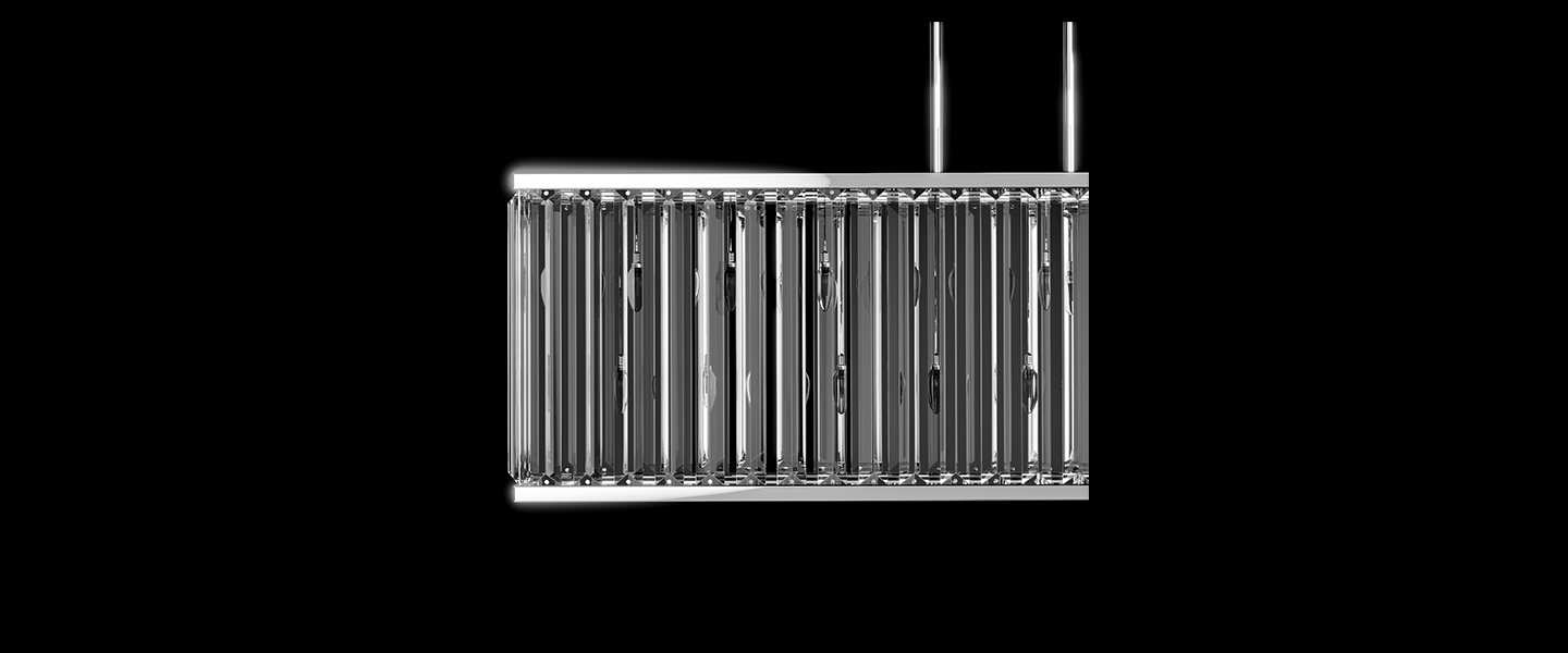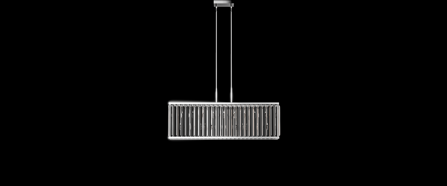 A modern rectangular chandelier with vertically set crystal blades, suspended by twin rods and finished in high-gloss finish. Designed for contemporary dining and lounge spaces where clean geometry meets subtle shimmer.