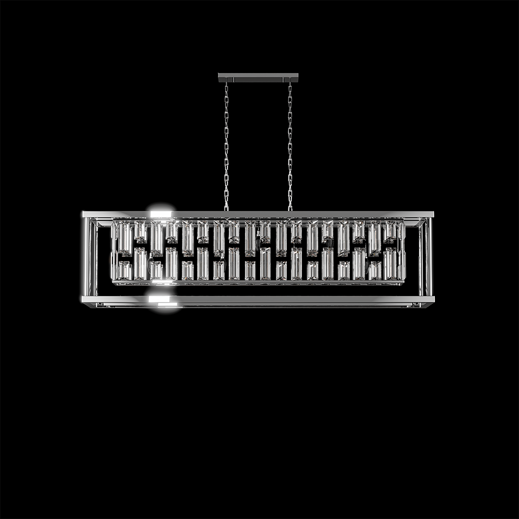Gridlight channels geometric elegance through a striking matrix of faceted crystal prisms encased in a minimalist chrome frame. Its bold rectangular profile is softened by the cascading glow of tiered crystal rods, creating a dynamic play of light and shadow. Perfect for dining rooms or statement spaces, this design balances architectural clarity with ornamental brilliance.