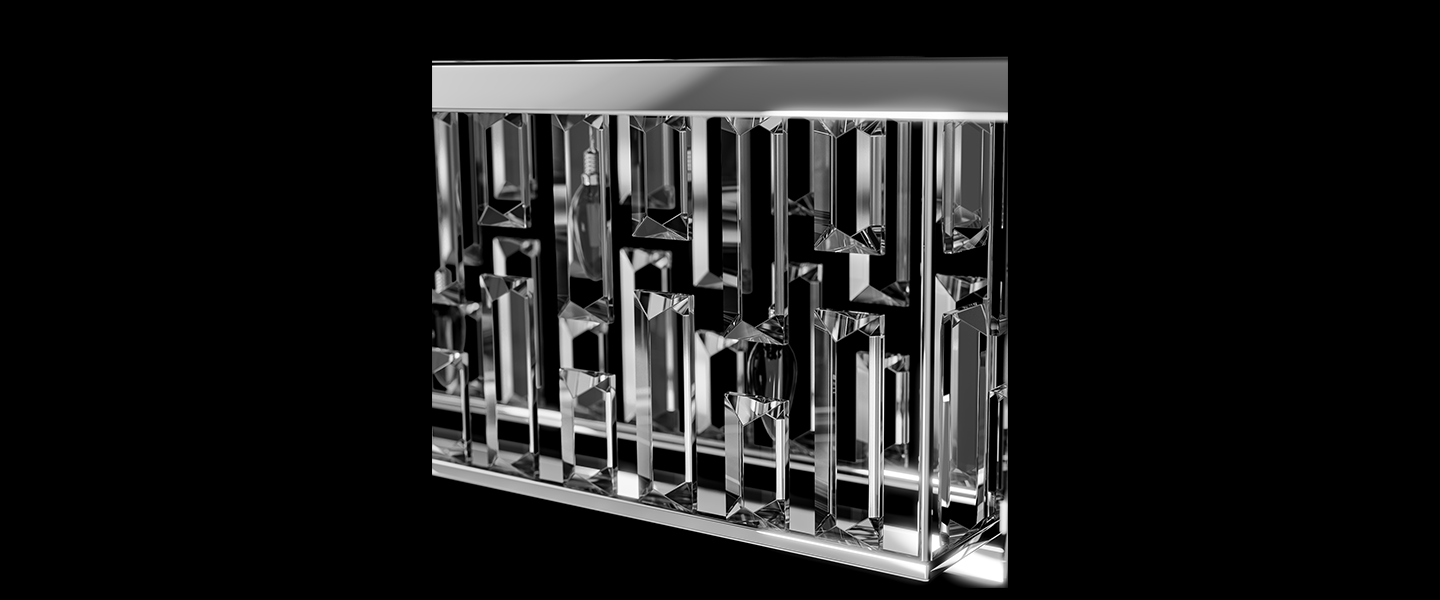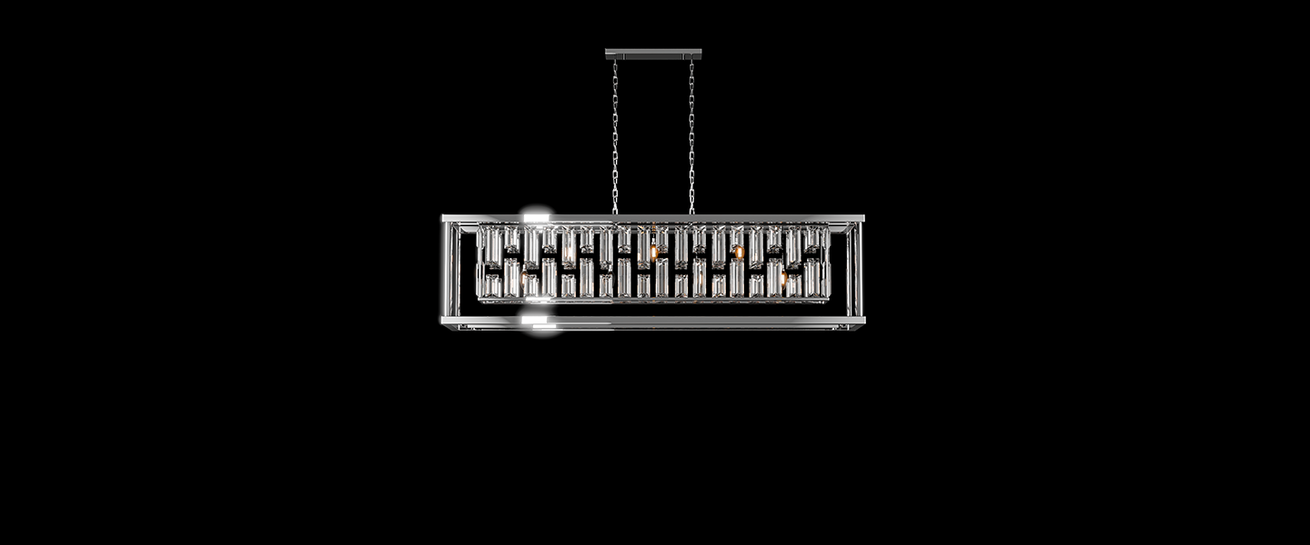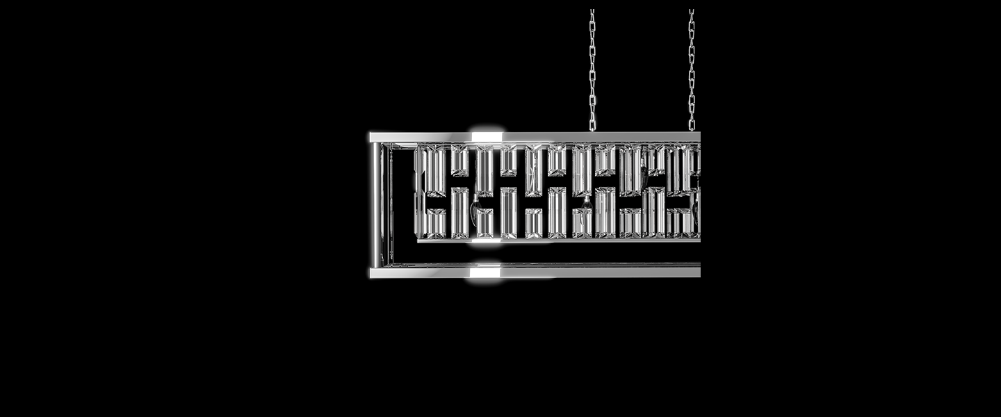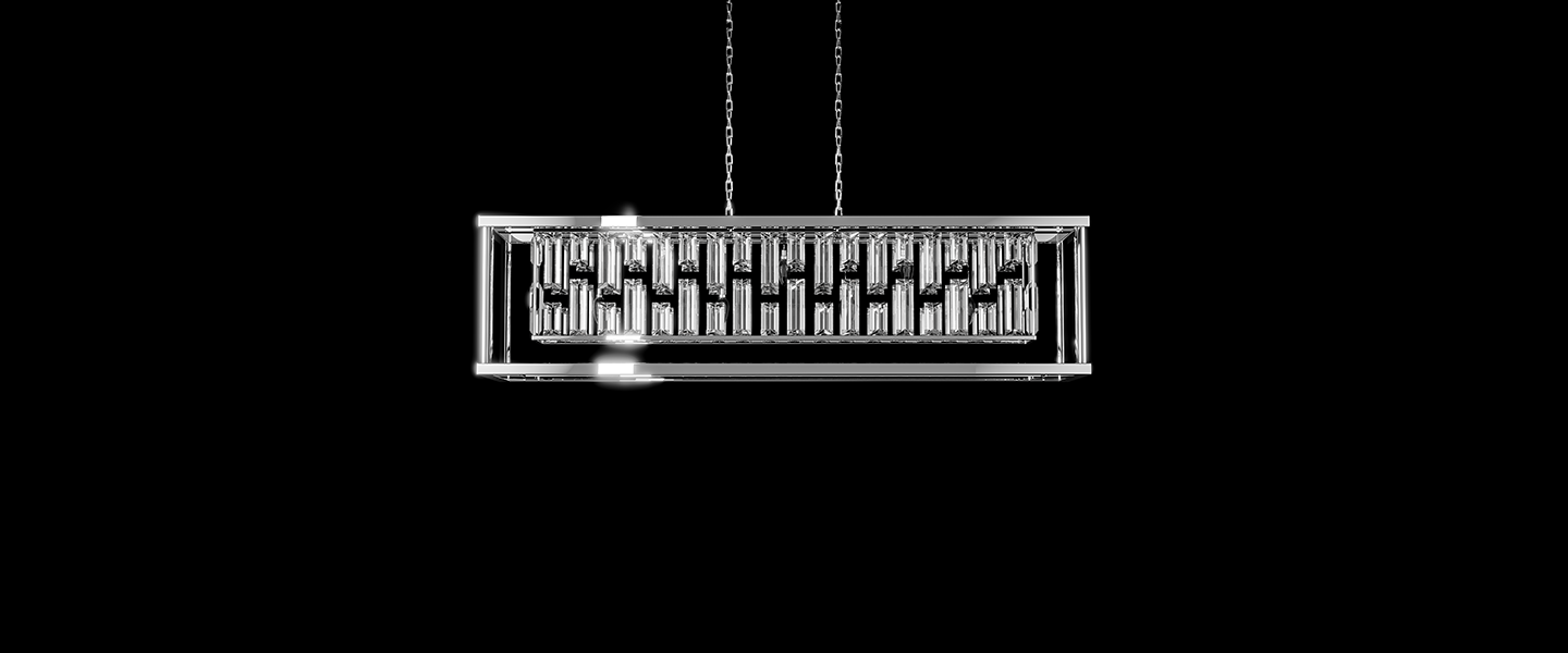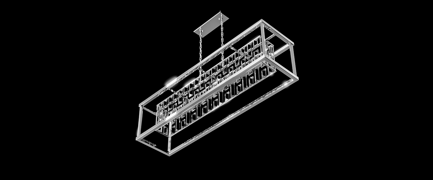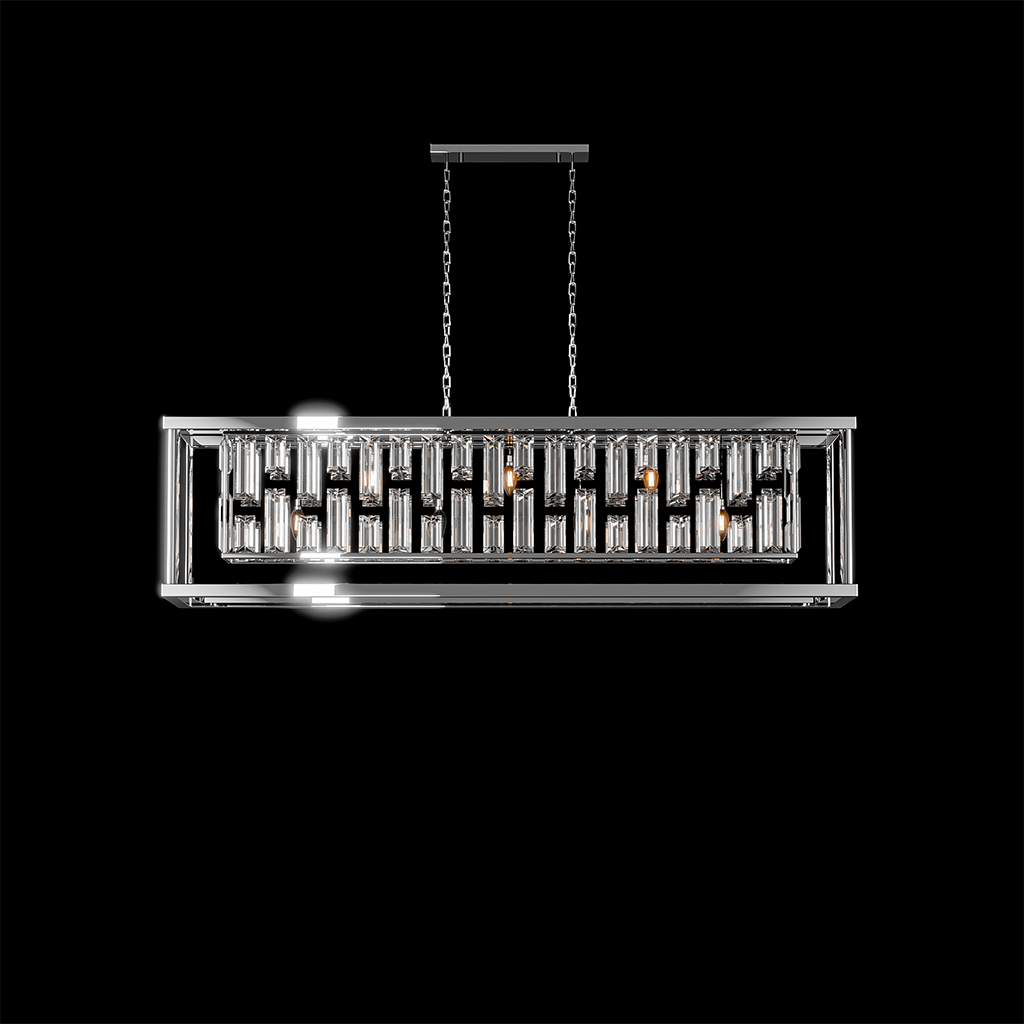Gridlight channels geometric elegance through a striking matrix of faceted crystal prisms encased in a minimalist chrome frame. Its bold rectangular profile is softened by the cascading glow of tiered crystal rods, creating a dynamic play of light and shadow. Perfect for dining rooms or statement spaces, this design balances architectural clarity with ornamental brilliance.