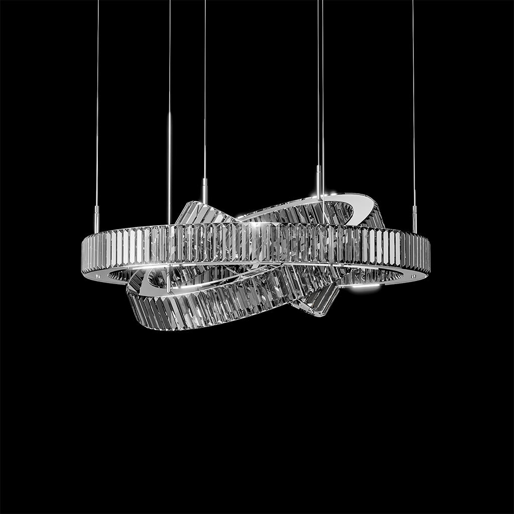 Inspired by the elegance of perpetual motion, Infinity Loop is a sculptural chandelier that mesmerizes with its fluid curves and reflective brilliance. The overlapping elliptical rings, clad in vertical high-clarity crystals, create a dynamic interplay of light and shadow. Designed to be the statement centerpiece for contemporary interiors, this chandelier exudes modern luxury with a graceful twist.