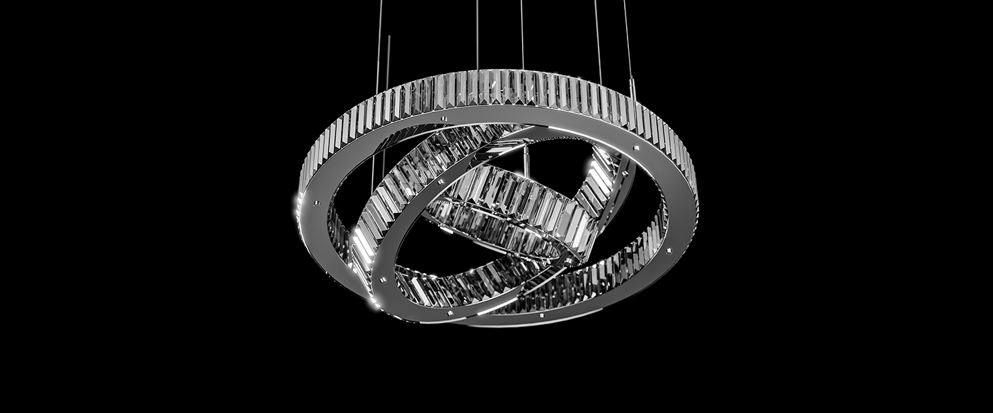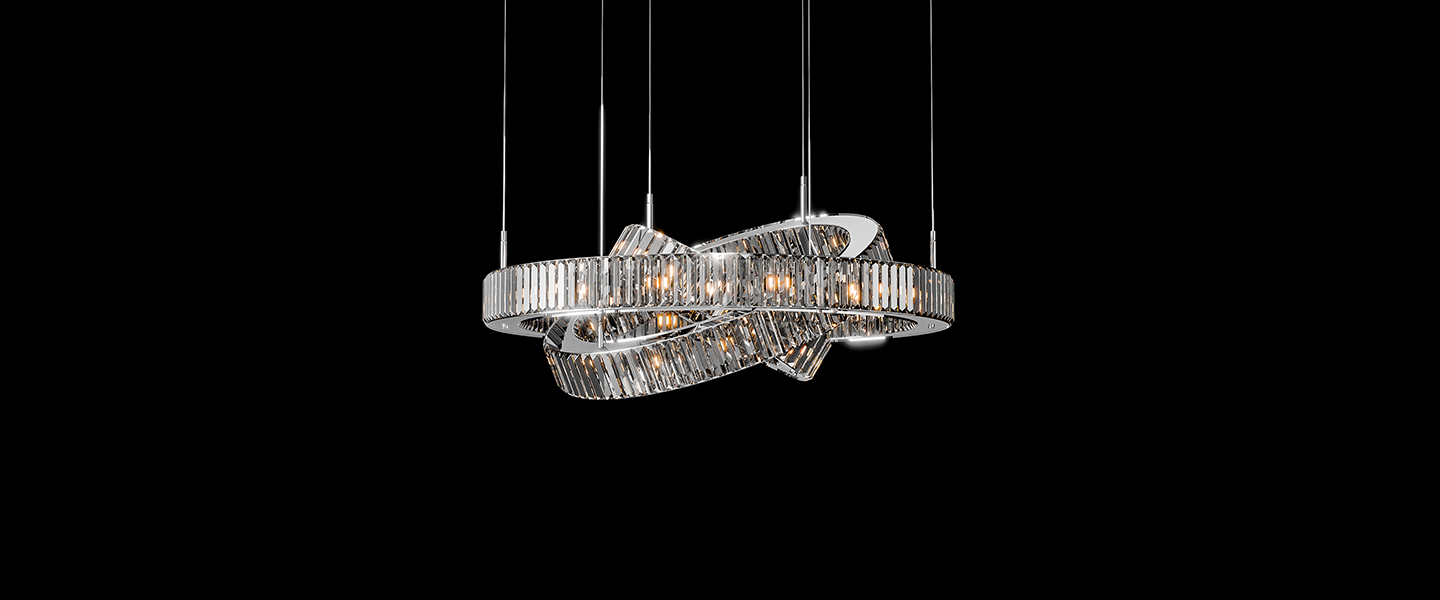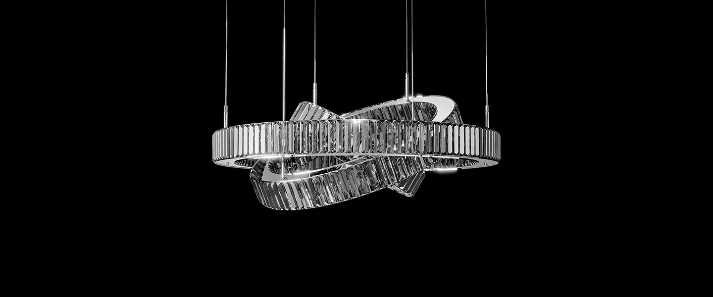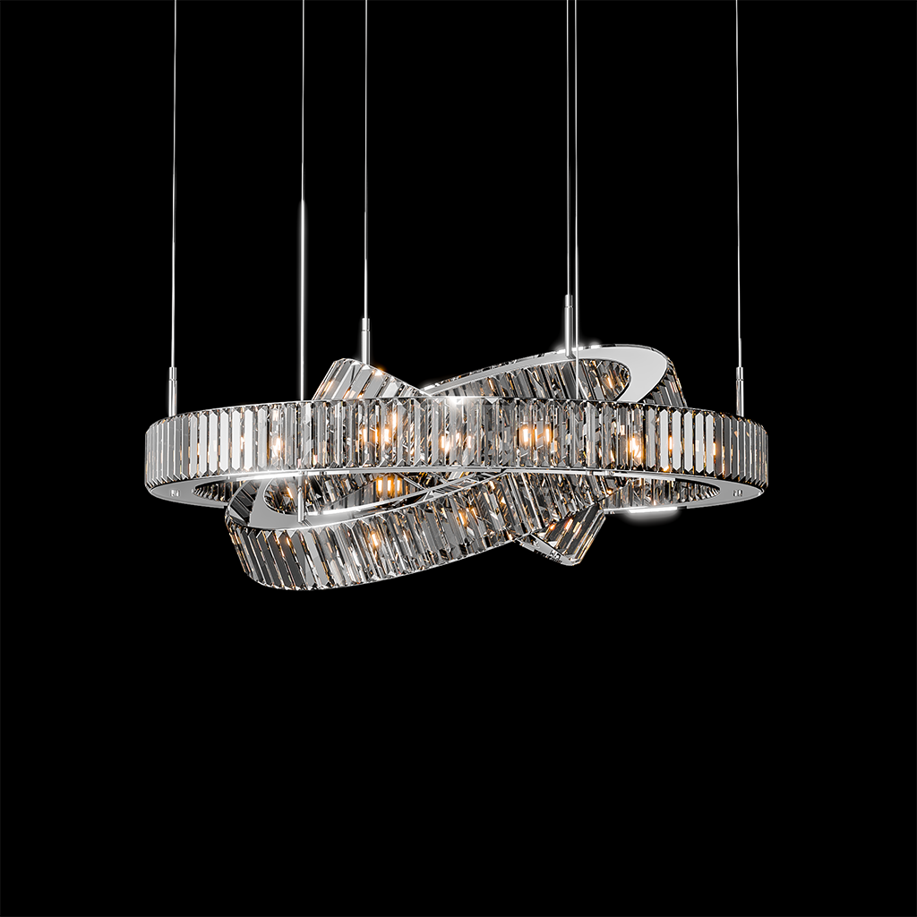 Inspired by the elegance of perpetual motion, Infinity Loop is a sculptural chandelier that mesmerizes with its fluid curves and reflective brilliance. The overlapping elliptical rings, clad in vertical high-clarity crystals, create a dynamic interplay of light and shadow. Designed to be the statement centerpiece for contemporary interiors, this chandelier exudes modern luxury with a graceful twist.