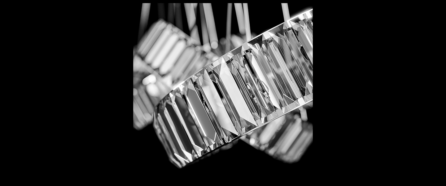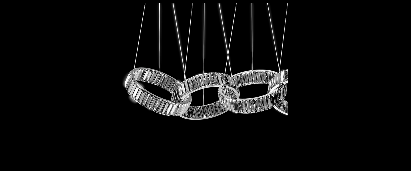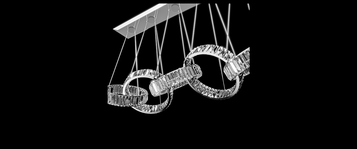 A bold and fluid expression of connectivity, Linka features a striking sequence of interlocked crystal-ring forms suspended in perfect symmetry. Each oval loop is adorned with high-clarity linear-cut crystals that diffuse the internal glow, creating radiant harmony. Its structural elegance and contemporary silhouette make it an exquisite centerpiece for elongated dining tables or spacious entryways.
