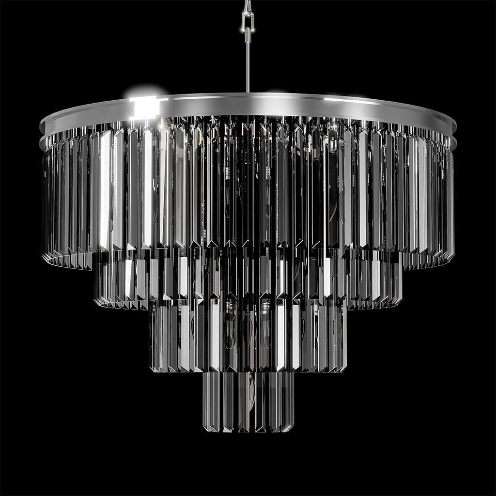 A commanding presence in dark crystal and chrome, Obsidian Rain cascades with unapologetic drama. Its sharply faceted prisms—layered in a graduated silhouette—evoke midnight downpours caught in candlelight. Designed for luxury interiors that dare to be bold, this chandelier radiates both mystery and brilliance in equal measure.
