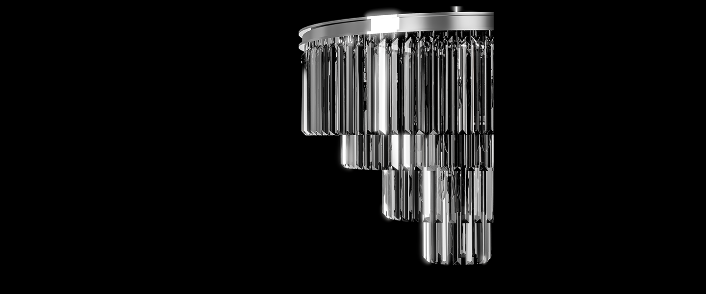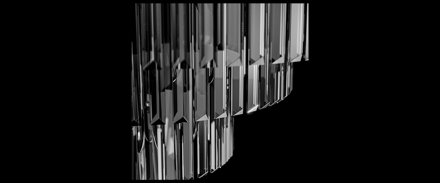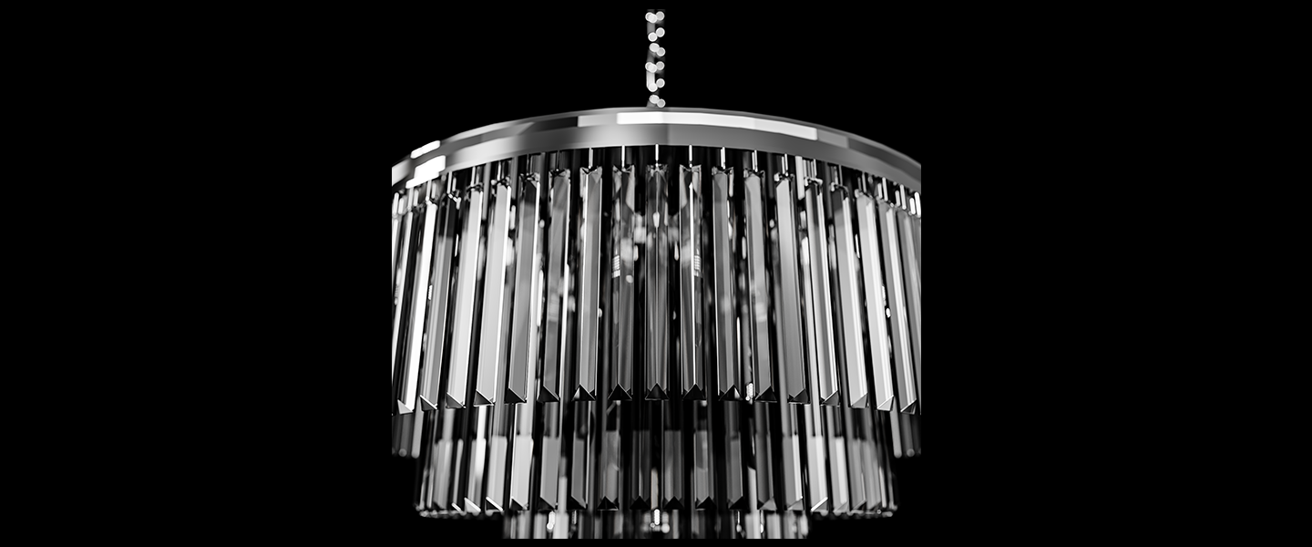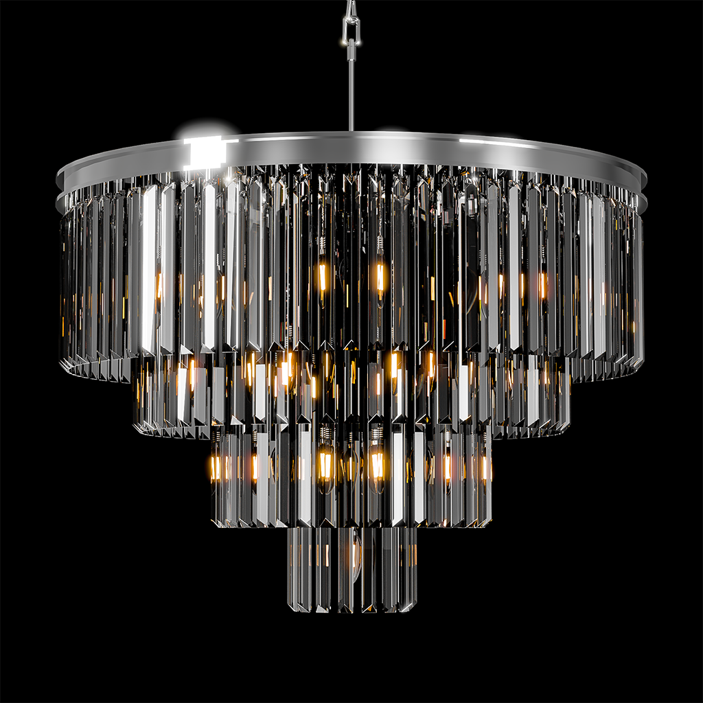 A commanding presence in dark crystal and chrome, Obsidian Rain cascades with unapologetic drama. Its sharply faceted prisms—layered in a graduated silhouette—evoke midnight downpours caught in candlelight. Designed for luxury interiors that dare to be bold, this chandelier radiates both mystery and brilliance in equal measure.
