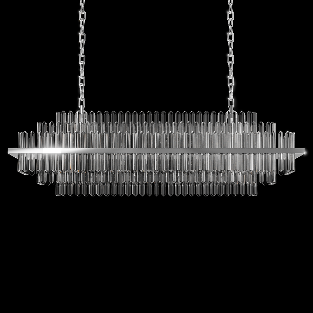 Sculpted with rows of vertical glass rods and a polished chrome frame, the Ravello chandelier delivers a symphony of light and symmetry. Its elongated linear form creates a bold architectural statement, ideal for dining spaces and gallery-like interiors. The precise alignment of each crystal element ensures balanced illumination and visual rhythm, while the diffused lighting provides an elegant ambient glow.