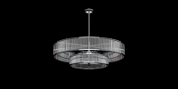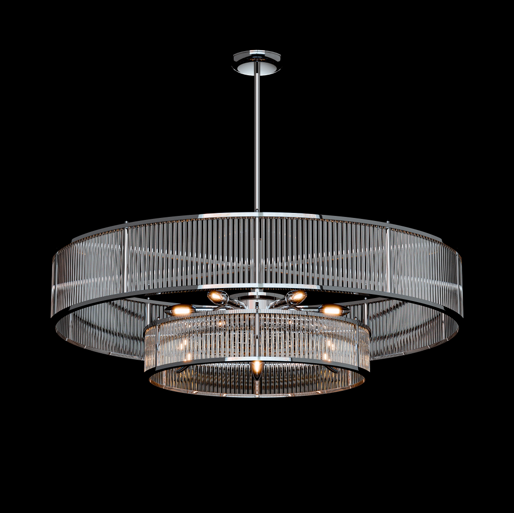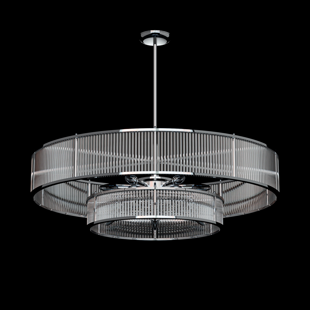 Stratix features dual concentric drum shades made of vertical glass fins, creating a dynamic interplay of shadow and transparency. The polished chrome frame anchors the design, while exposed bulbs within cast a balanced glow — making it a perfect fit for bold, contemporary spaces.