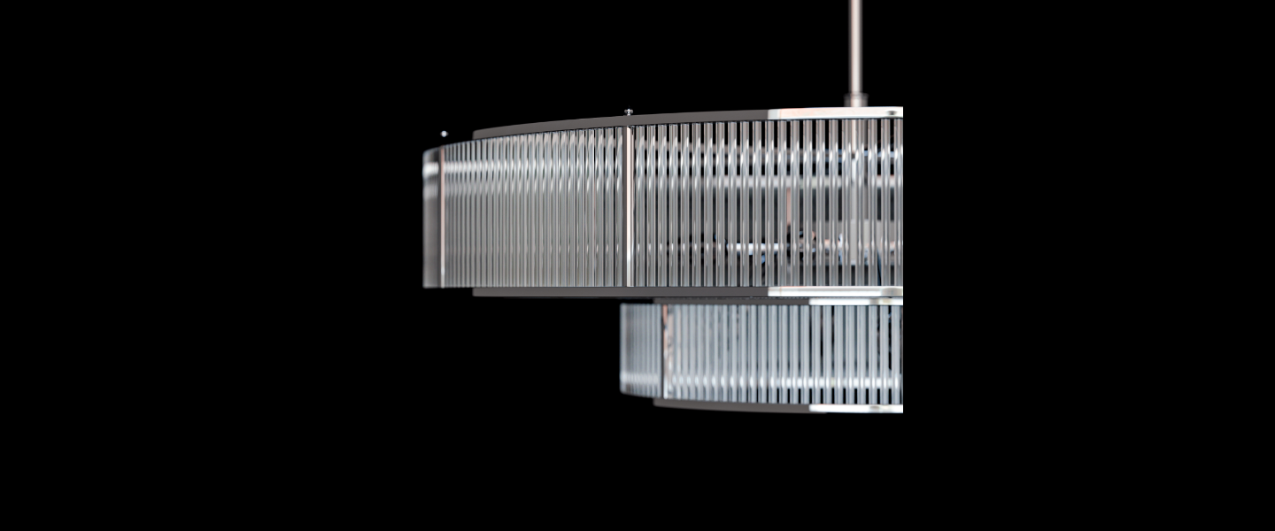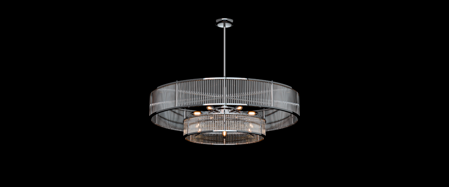Stratix features dual concentric drum shades made of vertical glass fins, creating a dynamic interplay of shadow and transparency. The polished chrome frame anchors the design, while exposed bulbs within cast a balanced glow — making it a perfect fit for bold, contemporary spaces.